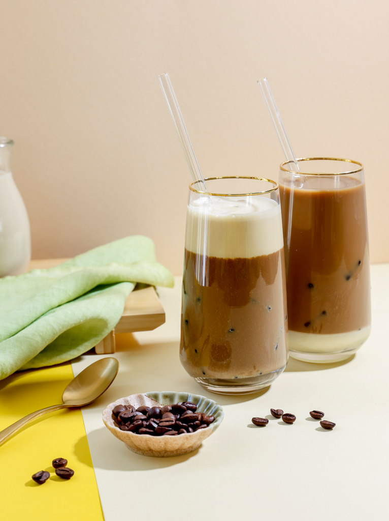 3. Gieße das Glas mit dem Kaffee auf und füge noch einen Schluck kalte Milch hinzu, falls dir das Getränk zu stark ist. Gut umrühren und genießen!