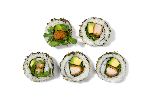 - 5x California XL Chicken Katsu (gefüllt mit frittiertem Hähnchen-Katsu, Avocado, Rucola, Chilisauce und scharfer Gewürzzubereitung)