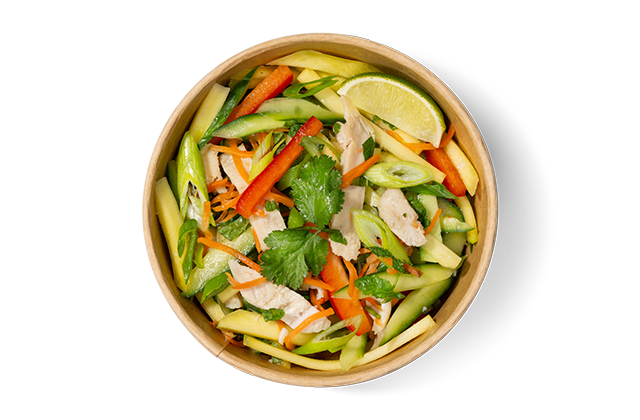 Salatzubereitung mit Hähnchenbruststreifen (19,6% Hähnchen bezogen auf das Gesamtgewicht), Mango, Gurke, Paprika, eingelegten Karotten und Salatdressing asiatischer Art.