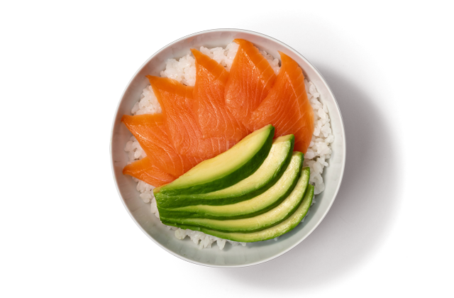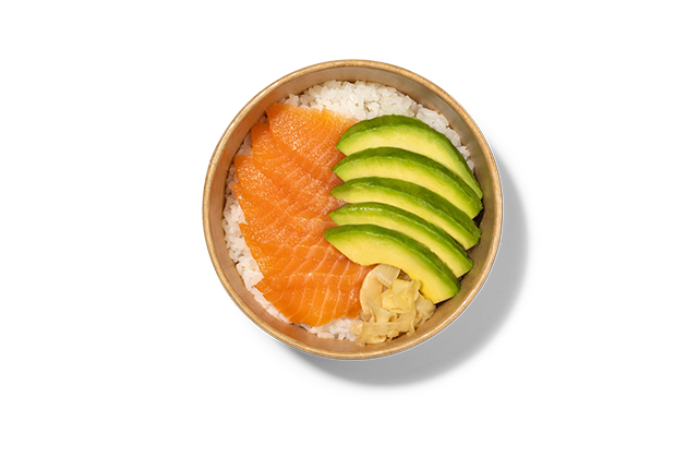 Die Donburi Lachs Avocado ist eine Reisschale, die mit Lachs und Avocado gefüllt ist.
