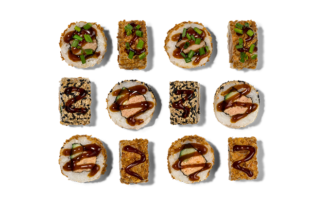 - 4x California Crunchy Cooked Salmon (gefüllt mit Gurke, Lachsfarce und getoppt mit Röstzwiebeln und Teriyaki Sauce)