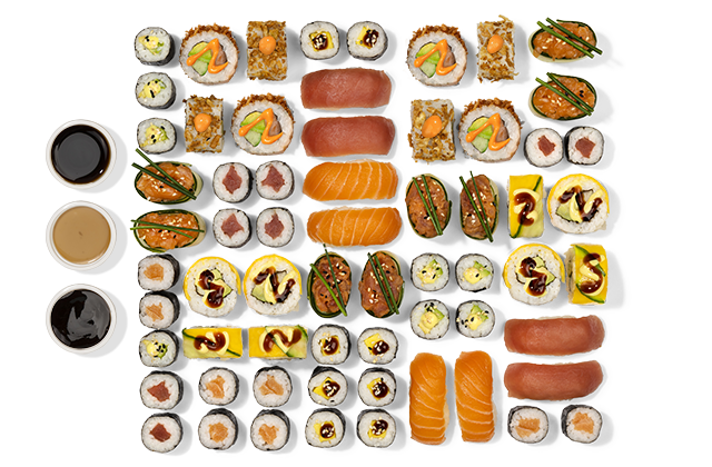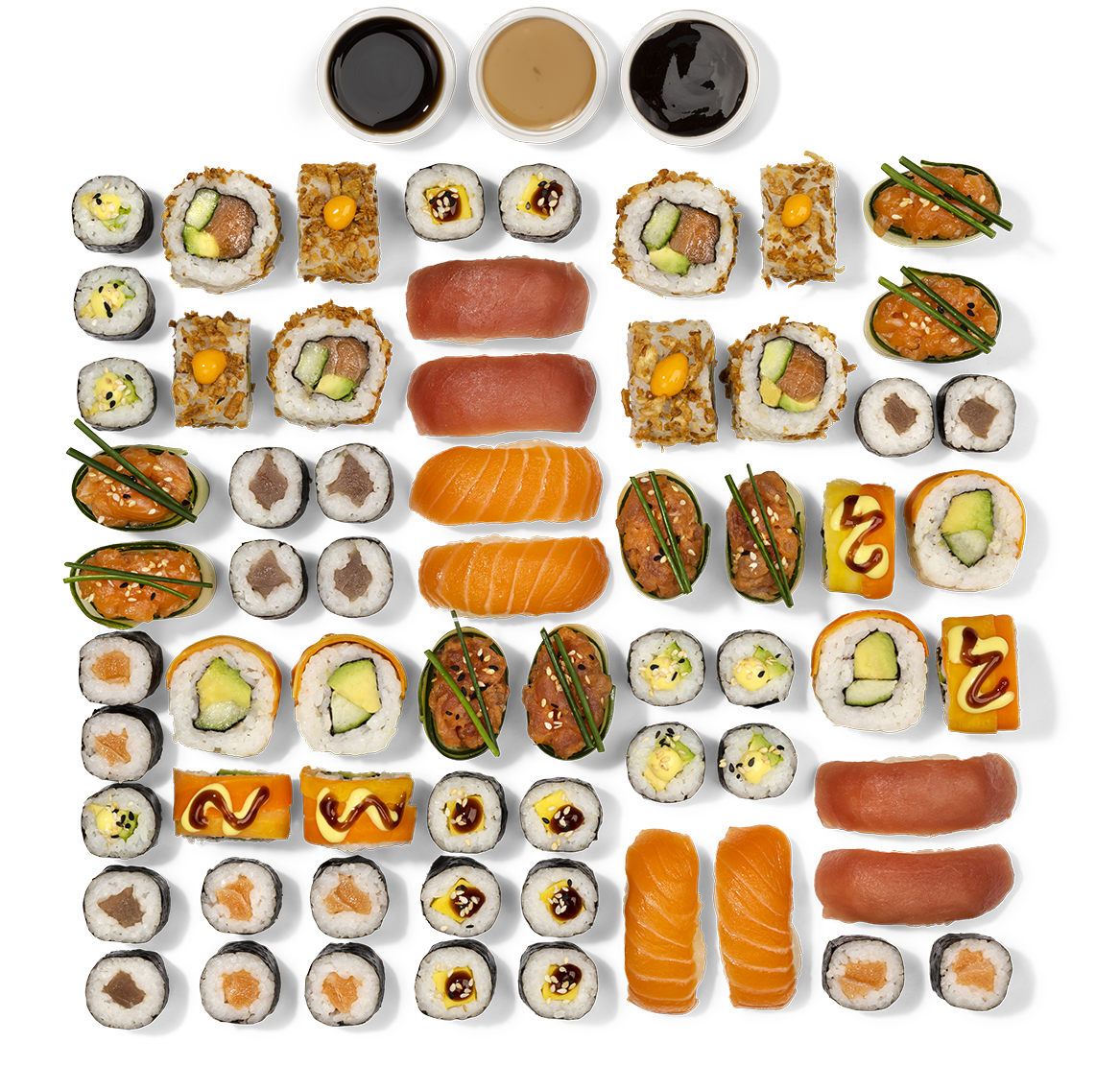 It’s a kind of magic! Unsere bezaubernde Sushi-Platte enthält 64 brandneue Sushi-Rolls für dich und deine Liebsten. Verzaubere sie mit einem neuen Sushi-Taste – von Gunkan Rolls bis hin zu Rainbow Mango Gurke mit leckeren Saucen on top.