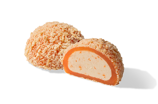 Reisdessert mit cremiger Füllung mit Karottenstückchen, ummantelt mit Mürbegebäck, aufgetaut.