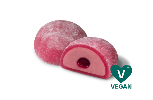 Veganes Reisdessert nach japanischer Art, gefüllt mit einer Himbeercreme und Himbeerfruchtaufstrich, aufgetaut.