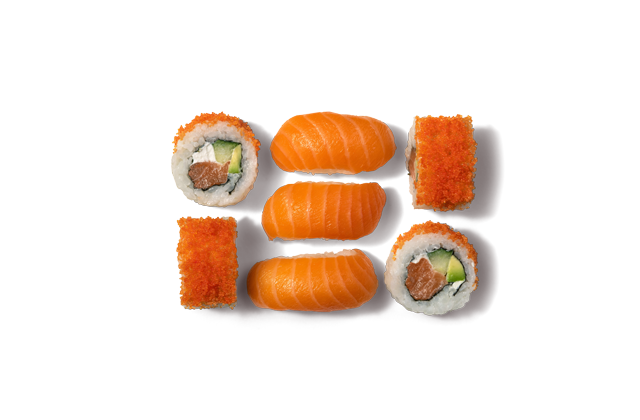- 4x California Masago Lachs (gefüllt mit Lachs, Avocado, Gurke, Frischkäse und als Topping Masago)