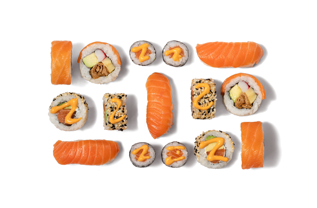 - 4x Rainbow Lachs Spicy (gefüllt mit Avocado, Surimi, Tamago, Inari und als Topping Lachs und Chili-Creme)