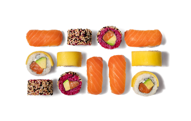 - 4x Rainbow Mango (gefüllt mit Lachs, Avocado, Frischkäse und Mango-Topping)